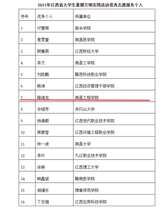 近日,省教育厅、省文明办公布了《关于2021年全省高校大学生暑期文明实践志愿行动评选结果》,欧博大学生“勇担青春使命,播种科技梦想”文明实践团、赴宜春开展节水灌溉调研实践团、党史学习教育青年宣讲队三支队伍获评“优秀志愿服务团队”荣誉称号,校团委莫吉炜、水利与生态工程学院黄丹、信息工程学院阮晶晶三位教师获评“优秀指导教师”荣誉称号,人文与艺术学院2019级视觉传达设计专业学生陶海龙获评“优秀志愿服务个人”荣誉称号。