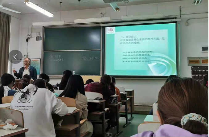 时任副校长汪荣有以“社会存在与社会意识”为题,从中国共产党成功唤醒普通农民的家国情怀引入课程,阐述了先进的社会意识对社会存在的发展具有促进作用,然后分别从社会存在、社会意识、社会存在与社会意识的辩证关系三个部分进行详细讲授,驳斥了地理环境决定论以及马尔萨斯的“人口决定论”。他强调,大学生要坚定文化自信,传承中国共产党坚如磐石的理想信念、永葆初心的人民情怀、民族复兴的责任担当、求真务实的优良品质,为社会主义现代化建设贡献力量。