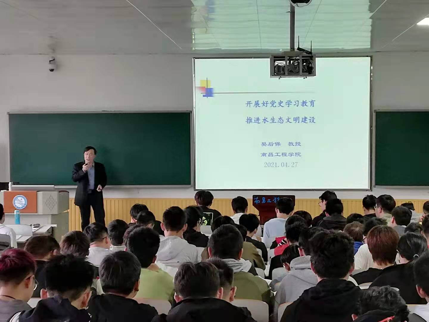 副校长樊后保以“开展好党史学习教育,推进水生态文明建设”为题,从中国古人治水实践和新中国的水利事业发展历史引入课程,阐述了古人“治国先治水”的治国理念,以及历代党和国家领导人对水利工程的重视。他从中国水资源概况、中国水环境问题、可持续发展理论的诞生、生态文明理念的演进、习近平生态文明思想解读等五个部分进行详细讲授,并强调,大学生要学史明理、学史增信、学史崇德、学史力行,了解我们国家的能源状况,重视生态文明建设。