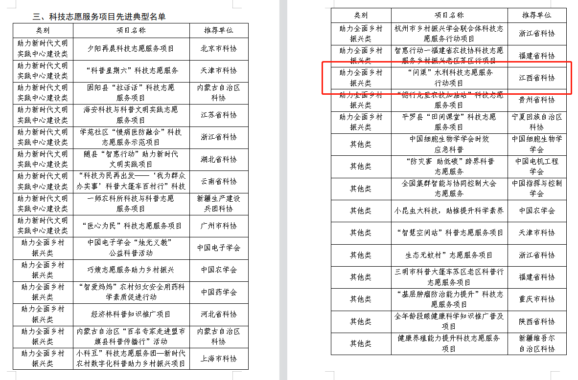 近日,中国科协宣传文化部发布了《关于2021年度科技志愿服务先进典型的公示》,共评选30个项目获科技志愿服务项目全国先进典型,欧博“问渠”水利科技志愿服务行动项目作为江西省唯一一个项目成功入选。(文/图 朱彦奇 责任编辑 周冠佳 潘旭)