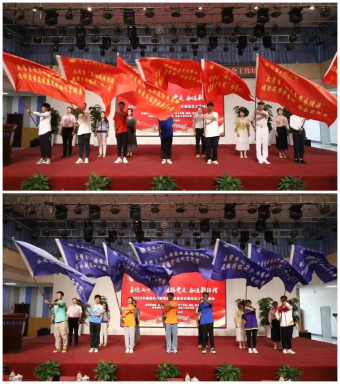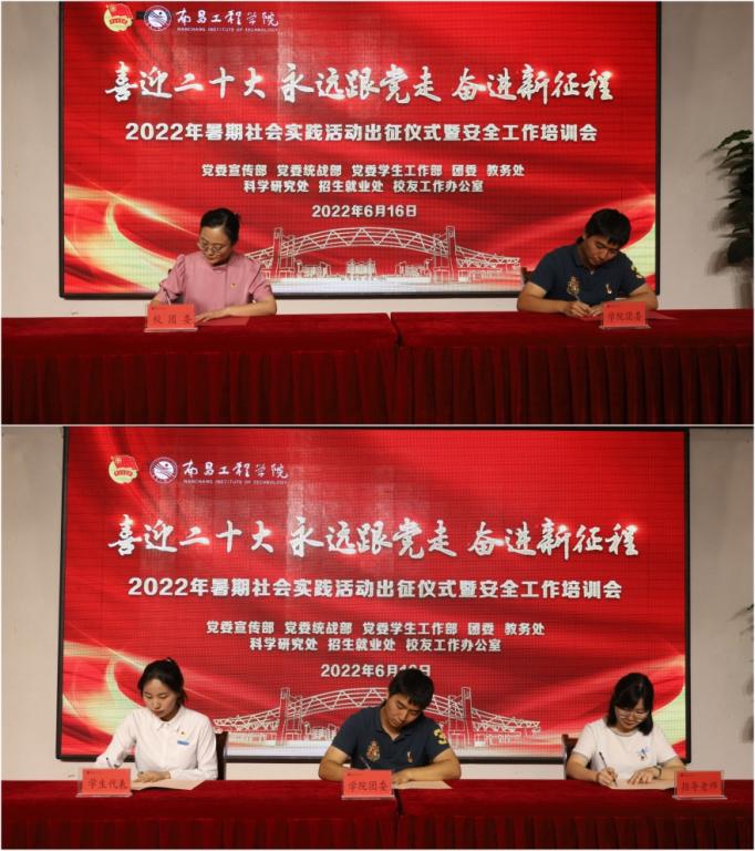 仪式上,校领导为各实践团队授旗,参加暑期社会实践的团队师生代表进行了表态发言。校团委与学院团委,学院团委与实践团带队老师、团队负责人分别签订了2022年暑期社会实践安全责任书。