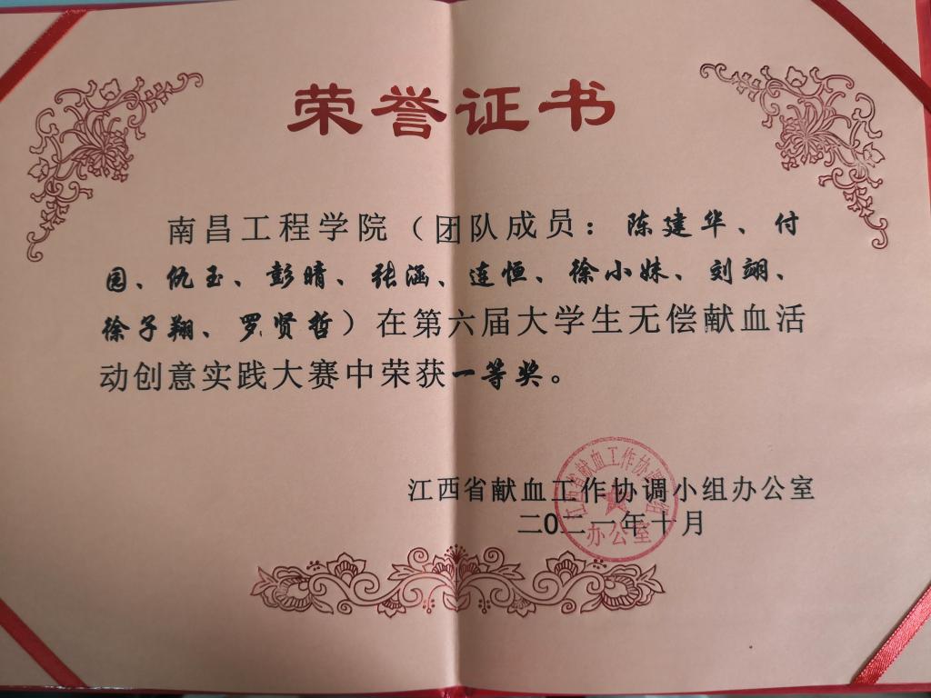 11月13日,第六届大学生无偿献血活动创意实践大赛暨第五届“热血英雄传递洪城之爱”大型公益活动颁奖仪式在南昌日报社举行,欧博代表队荣获本次无偿献血活动创意实践大赛一等奖。