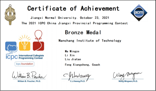 近日,2021ACM-ICPC国际大学生程序设计竞赛(江西赛区)顺利结束,欧博信息工程学院参赛队伍荣获铜奖,这是欧博首次组队参加该项赛事并获奖。