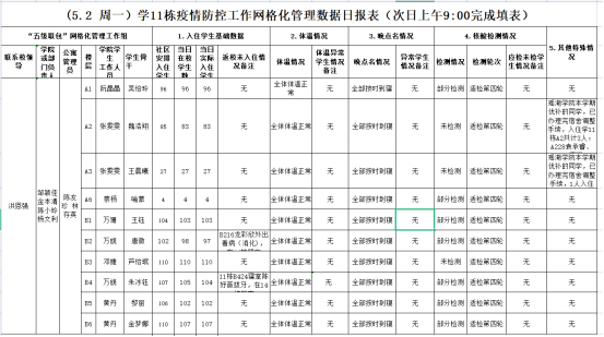 面对如此严峻的形势,工作组在学校党委的统一部署下,先后多次召开动员部署会、工作交流会,不断完善网格化管理工作体系,及时研究判断安全风险隐患。为精准掌握学生情况,工作组建立工作群和日常管理台账,设计《学11栋疫情防控工作网格化管理数据日报表》,将楼栋按楼层分为10个区域,将7位学生工作人员和10名学生骨干分成10个楼层网格员工作小组,按照1名学生工作人员搭配1名学生骨干的方式,及时向联系楼栋校领导、各有关学院和部门负责人报送动态,坚持日报告制度。