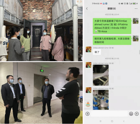 蔡杨老师负责11栋4个不同学院的留学生管理。为加强与留学生的交流,她建立了微信群,每天提醒留学生测量体温和核酸检测,叮嘱他们注意饮食,安心线上学习,多阅读多运动,给予这些外国孩子真切的人文关怀,让他们在异国感受到家的温暖。