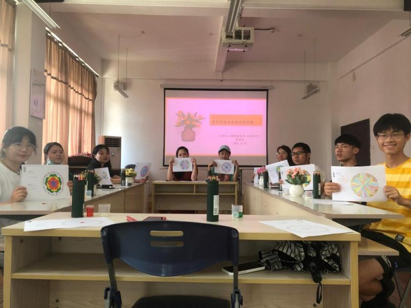 入眼——在缤纷色彩中宣泄情绪。“曼陀罗绘画情绪疗愈体验”活动采用曼陀罗绘画疗法,带领学生在放松训练过后,跟随自己的内心感受,选择喜欢的颜色对曼陀罗图案进行上色,让同学们在颜色填涂中宣泄情绪,纾解压力。