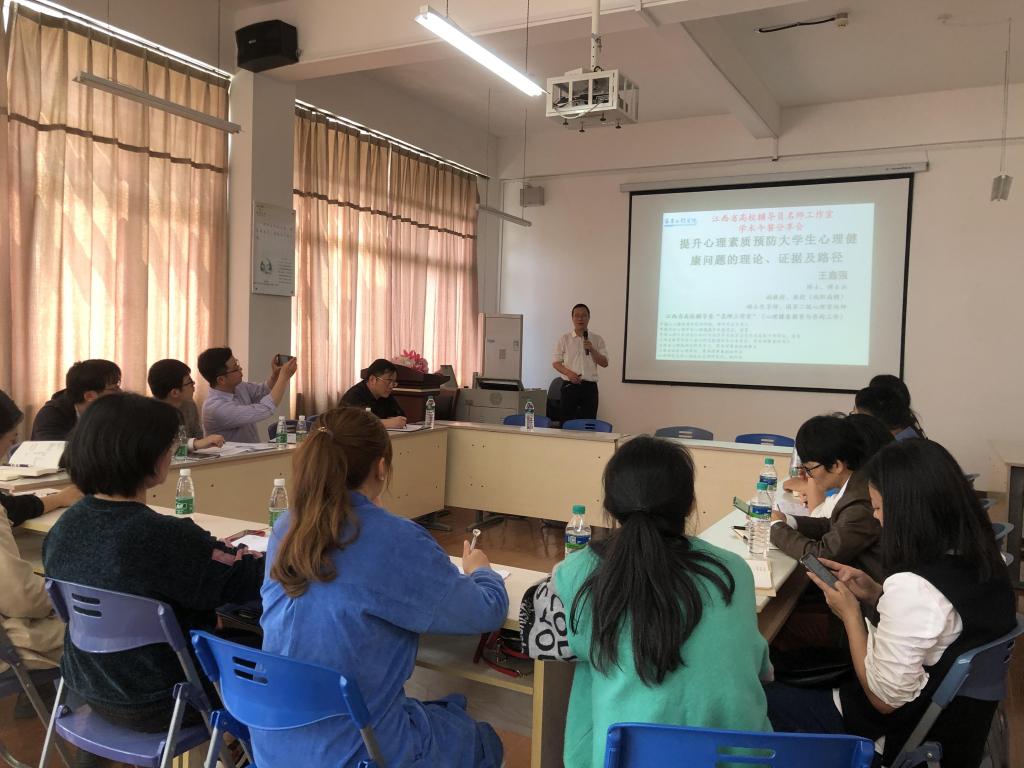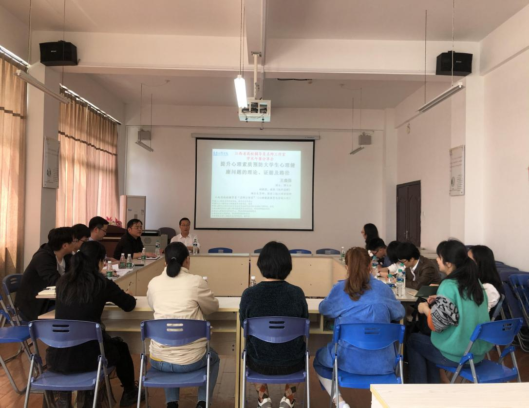 4月21日中午,江西省高校辅导员名师工作室(心理健康教育与咨询方向)、大学生心理健康教育与咨询中心在大学生活动中心A410会议室开展学术午餐分享会,邀请江西师范大学副教授王鑫强博士作题为《提升心理素质,预防大学生心理健康问题的理论、论证及路径》的学术分享。名师工作室主持人杨铖主持会议,工作室16名成员参与活动。