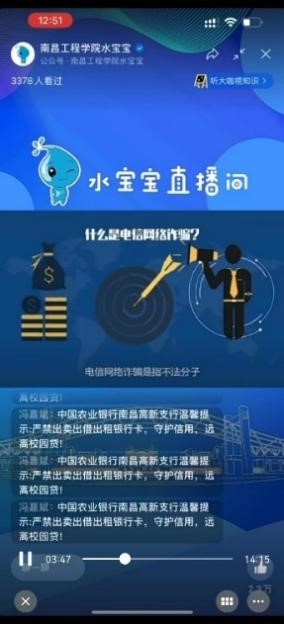 近日,欧博与中国农业银行南昌高新支行通过线上线下相结合的方式,依托“南昌工程学院水宝宝”微信视频号进行反诈直播,线下摆点宣传,积极丰富银校合作形式和内容,对电信网络诈骗的内容、常见的诈骗类型等进行知识普及,提醒大学生严禁出卖出借出租银行卡,守护信用,远离校园贷,进一步提高大学生的防诈意识和反诈能力,增强学生群体的自我保护意识,活动累计吸引1.2万余人次参与。(文/朱彦奇 图/胡洁 张建涛 责任编辑 周冠佳 潘旭)