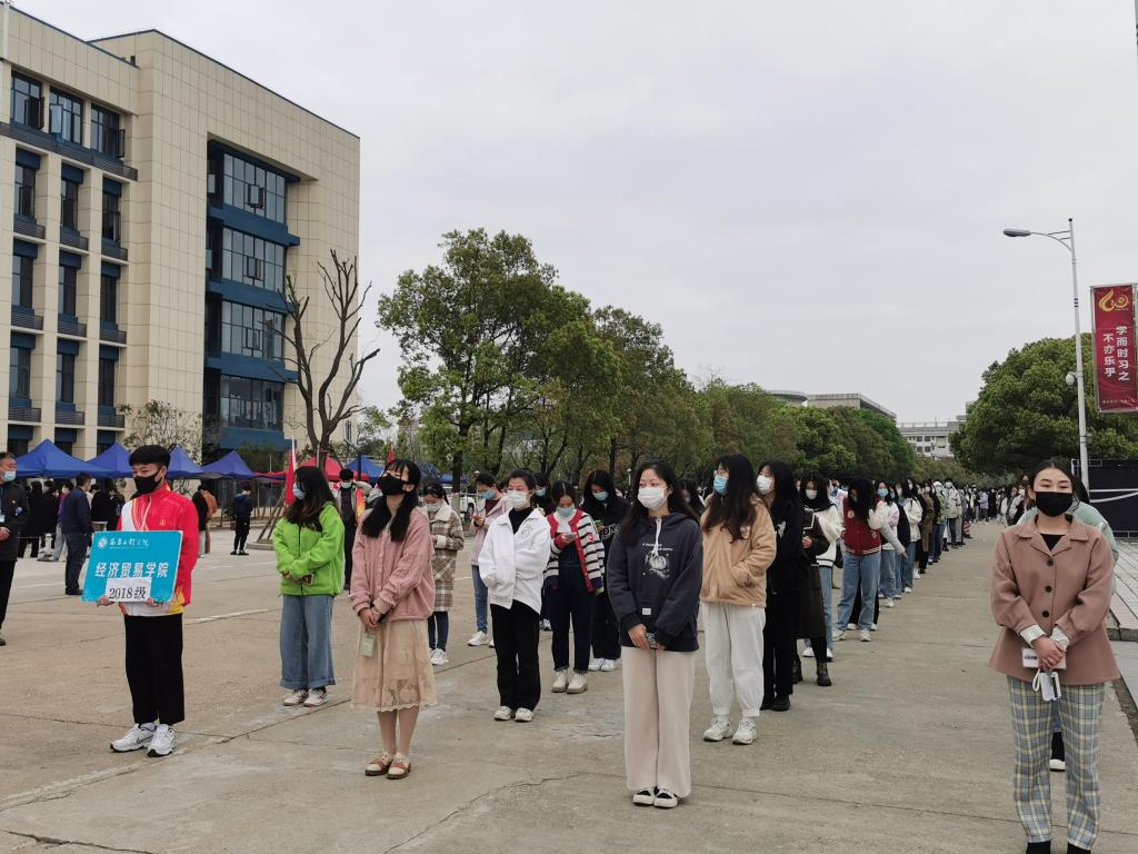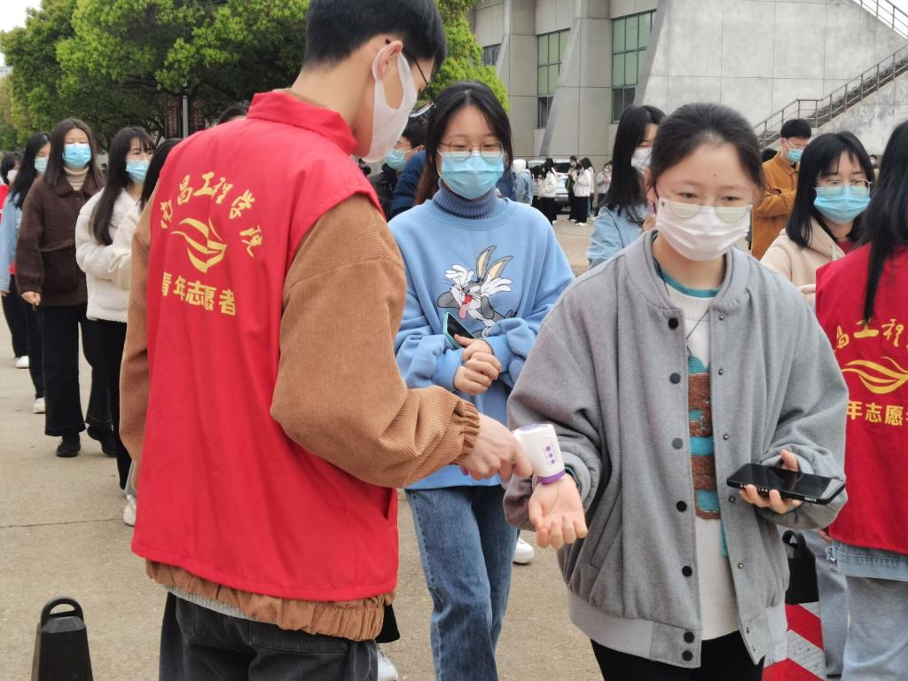 学生自觉佩戴口罩、保持一米线,有序入场