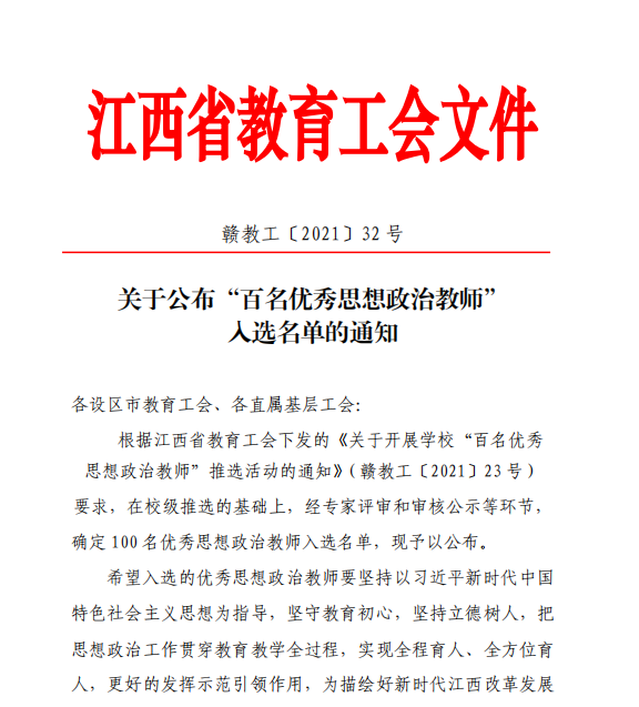 近日,江西省教育工会发布通知,公布了100 名优秀思想政治教师名单,欧博马克思主义学院教师杨宇辰成功入选。