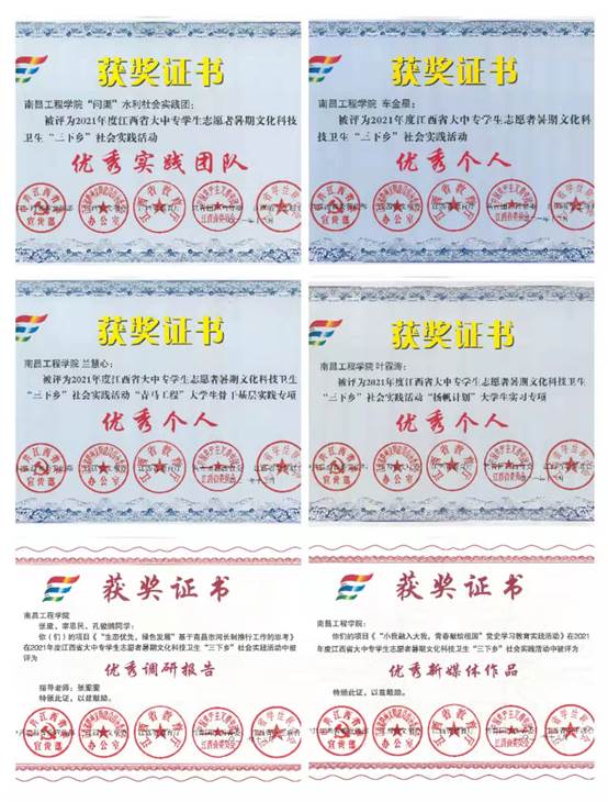 校团委获全省“优秀单位”荣誉称号,“问渠”水利社会实践团等4支团队获“优秀实践团队”荣誉称号,理学院车金星等8名师生获“优秀个人”荣誉称号,工商管理学院2019级物流管理专业兰慧心等2位同学获“‘青马工程’大学生骨干基层实践专项优秀个人”荣誉称号,国际教育学院2019级土木工程专业叶霖涛等2位同学获“‘扬帆计划’大学生实习专项优秀个人”荣誉称号,外国语学院2018级英语专业黄韵霖获“‘返家乡’社会实践优秀个人”荣誉称号,《新农村建设水平对山塘水管护质量影响分析》等2篇调研报告获“优秀调研报告”,《“小我融入大我,青春献给祖国”党史学习教育实践活动》等2项作品获“优秀新媒体作品”。(文/图 张建涛 责任编辑 周冠佳 潘旭)