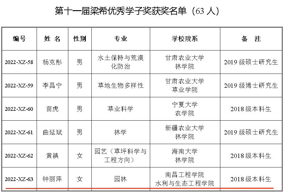 近日,中国林学会发布了第十一届梁希优秀学子奖评选结果,欧博水利与生态工程学院2018级园林专业钟丽萍同学荣获第十一届“梁希优秀学子”荣誉称号。目前,欧博学子已连续三届获得该奖项。