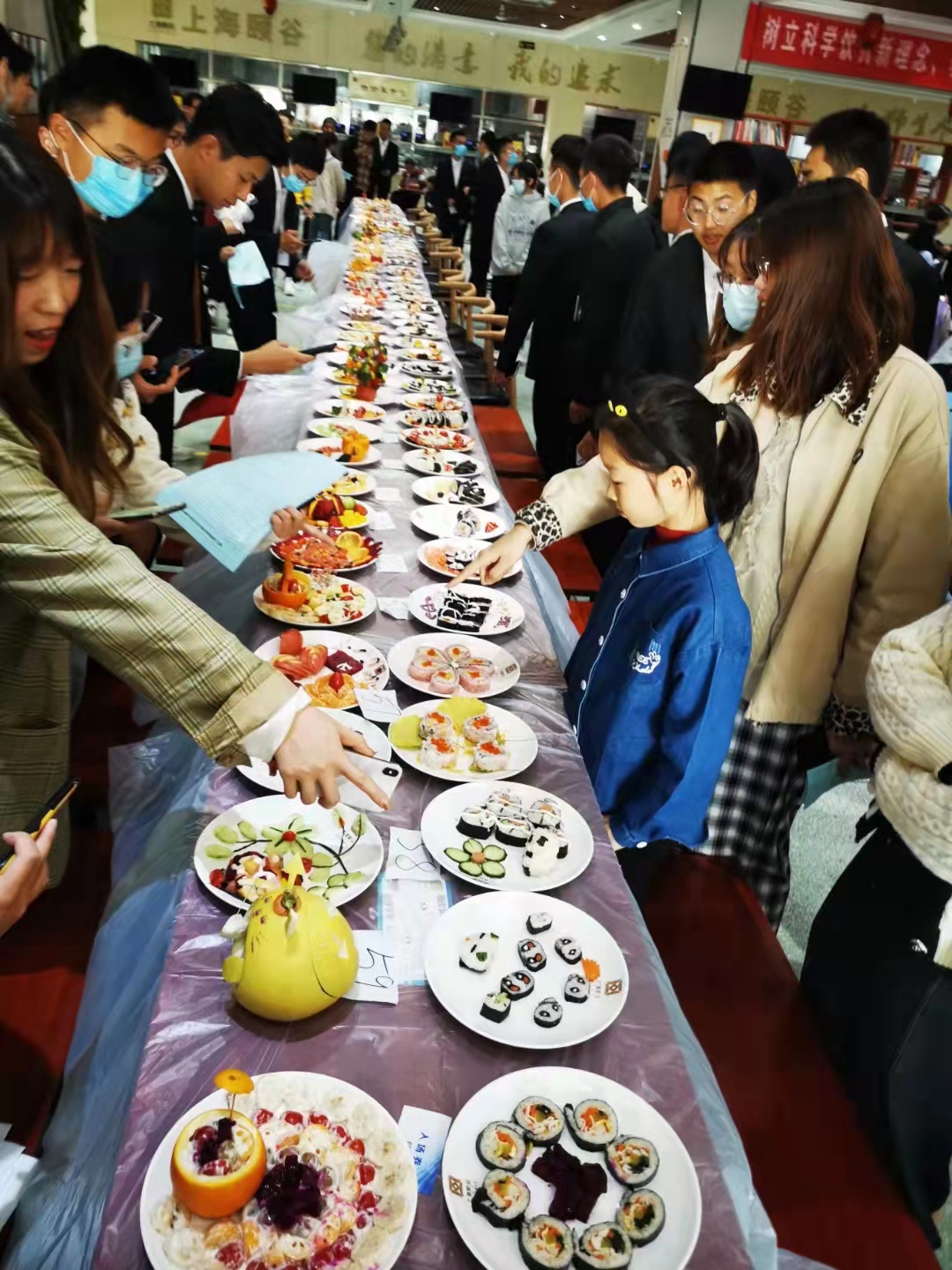 11月28日下午,“请党放心,强国有我——2021外语文化节”美食大赛在润园食堂举行,来自全校近60支参赛队伍参与现场制作。