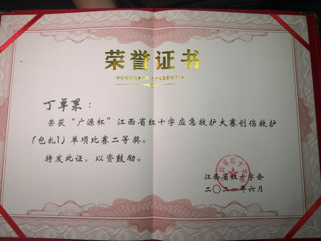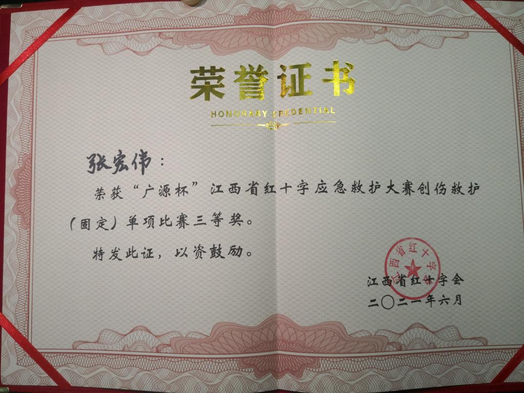 6月16日,由江西省红十字会主办,吉安市红十字会承办的“广源杯”江西省红十字应急救护大赛在吉安市举行,共有15支来自全省各设区市红十字会及部分高校代表队参加大赛。欧博经济贸易学院丁卓果同学获得创伤救护(包扎1)单项比赛的二等奖、人文与艺术学院张宏伟同学获创伤救护(固定)单项比赛三等奖,欧博获优秀组织奖。(文/图 付园 责任编辑 周冠佳 潘旭)