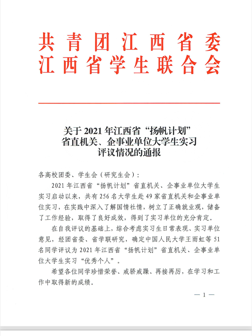 近日,共青团江西省委、江西省学生联合会发布了《关于2021年江西省“扬帆计划”省直机关、企事业单位大学生实习评议情况的通报》,欧博工商管理学院刘春剑、柯镇贤,经济贸易学院邹轶君,国际教育学院叶霖涛、郭煜洲等5名同学荣获2021年江西省“扬帆计划”省直机关、企事业单位大学生实习“优秀个人”荣誉称号。