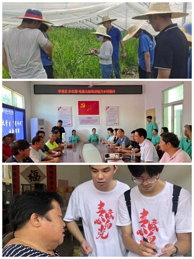 技术入乡,科技助农。7月9日-12日,各实践团深入基层调研当地产业发展总体情况,引导当地居民以科技为现代农业的突破口,因地制宜发展农村特色产业,开拓产业兴旺之路。水利与生态工程学院节水灌溉调研实践团赴宜春市彬江镇彬霞村诚信菜园,对当地温室采摘区大棚内土壤进行采样分析,用专业知识帮助当地居民合理高效生产,提高农作物产量。工商管理学院“红星闪闪”社会实践团赴黄马乡南安村开展电商公益培训,学院刘海明博士作专题辅导讲座,鼓励村民充分运用电商平台,扩大黄马乡富硒白莲等特色产业资源优势。理学院新农村建设水平对农村山塘水管护质量影响调研实践团先后赴黄溪村、杨家坪、谭坑村东浒寨,利用专业仪器测量当地山塘水溶氧量与PH值,调查农村山塘水管护质量影响因素,为当地居民提出保护及改善水质的建议。