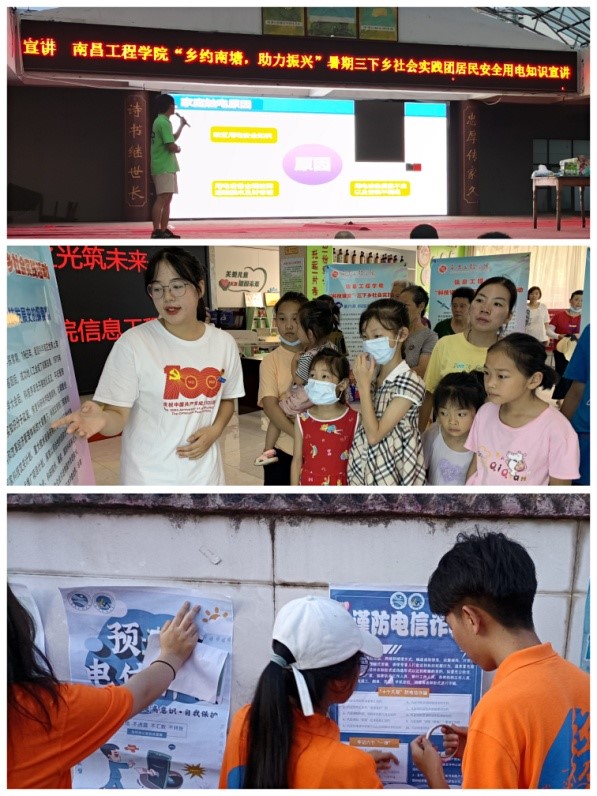教育到乡,知识兴农。7月8日,各实践团利用专业知识,贴合乡村经济发展实际,多形式、宽领域、全方位开展科学知识普及活动,提升农民科学素质,为乡村振兴注入强大力量。机械工程学院、电气工程学院“乡约南塘,助力振兴”社会实践团为当地村民宣讲安全用电知识,发放安全用电知识手册,并就现存用电安全问题提出解决方法。信息工程学院“勇担青春使命,播种科技梦想”社会实践团赴南昌市新建县长堎镇开展科技知识普及活动,增强当地居民对科技发展的认知与理解,引导居民充分利用现代科学技术手段提升农业生产水平、发展智慧农业。经济贸易学院“学党史守初心 服务乡村振兴”社会实践团赴江西省鹰潭市余江区张公桥,以发放宣传单、张贴海报、开展宣传会等形式为当地村民普及防诈骗、反邪教知识等。