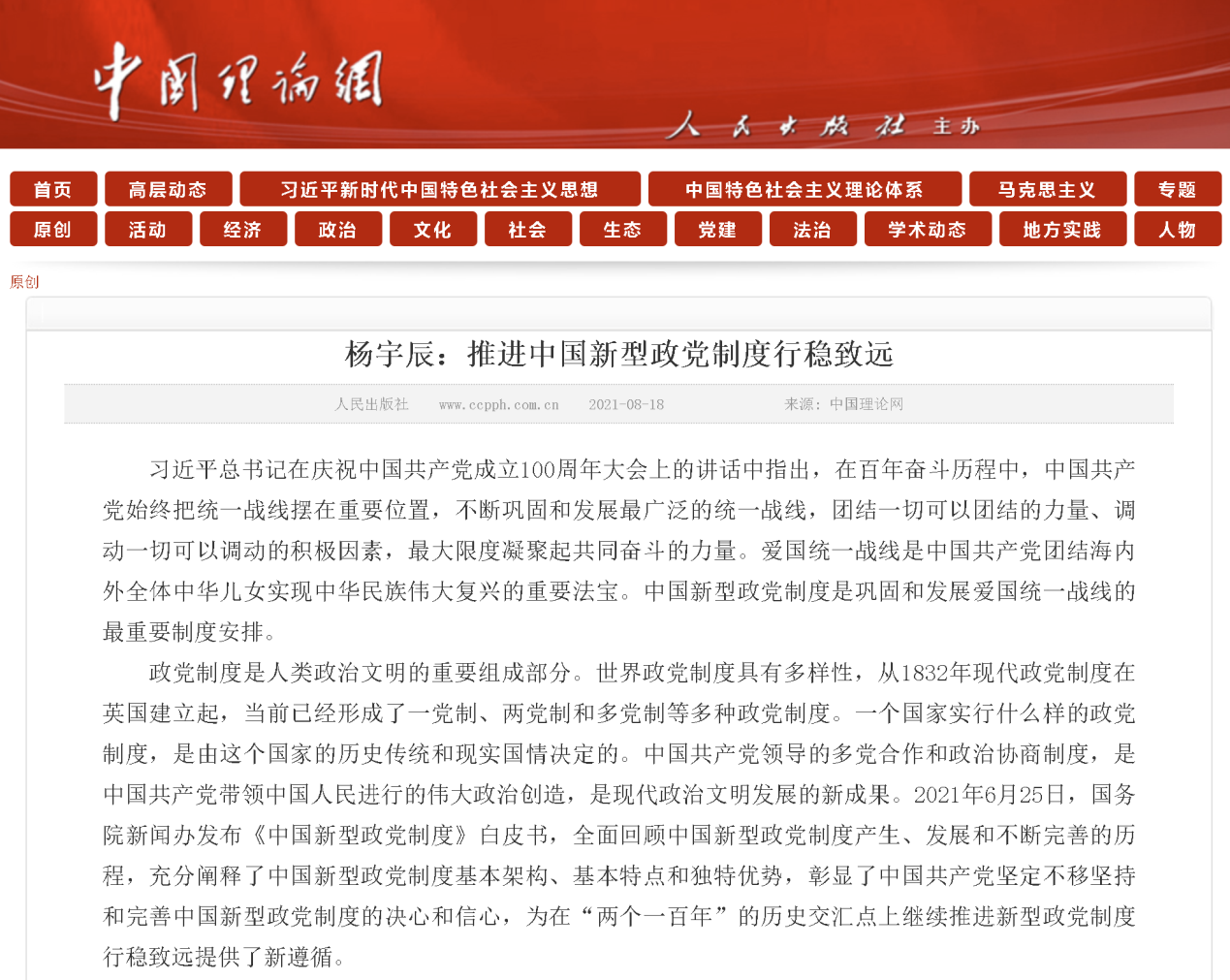 近日,马克思主义学院杨宇辰教授在中国理论网发表学习习近平总书记“七一”重要讲话精神心得文章《推进中国新型政党制度行稳致远》。文章指出,中国新型政党制度是巩固和发展爱国统一战线的最重要制度安排。在“两个一百年”的历史交汇点上继续推进新型政党制度行稳致远,要将坚持中国共产党的领导作为根本保证,将扎实推进多党合作制度建设作为关键环节,将努力提升政治共识作为基本落脚点,团结一切可以团结的力量、调动一切可以调动的积极因素,最大限度凝聚起共同奋斗的力量,进一步体现制度优势、激发制度效能,在人类政治文明发展史上谱写更加精彩的篇章。(文/图 罗小松 责任编辑 周冠佳 潘旭)