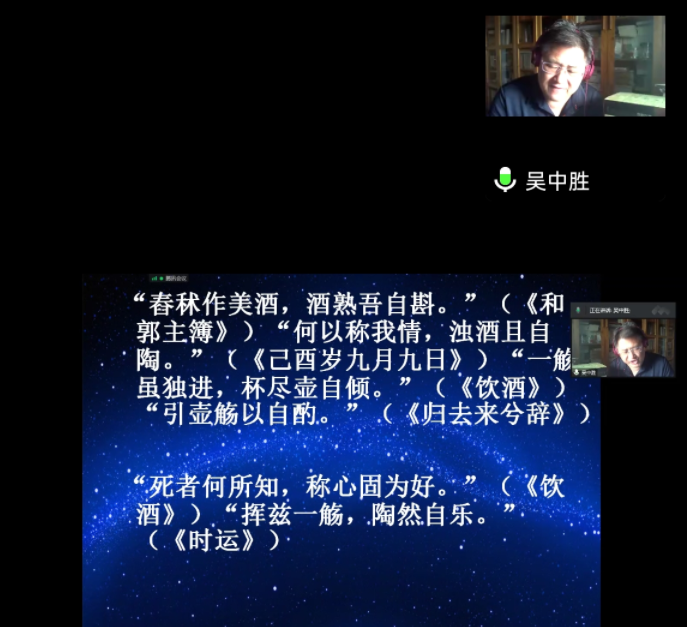 9月22日,赣南师范大学二级教授、全国优秀教师吴中胜博士在线上为欧博师生作“陶渊明的内修与自得”专题讲座。