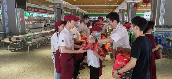 7月14日上午,正值南昌高温酷暑天气,副校长李培生先后来到部分施工项目现场、校园绿化清洁现场、食堂等走访慰问后勤保障处暑期坚守岗位的一线工作人员,并送上防暑降温慰问品。