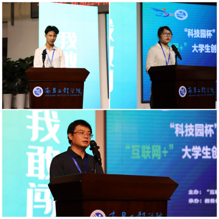 “互联网+”大赛国赛评委、金奖指导老师刘清华作为评委代表发言,电气工程学院青年教师袁小翠和2019级地质工程专业朱以勤分别作为指导老师和参赛学生代表发言。