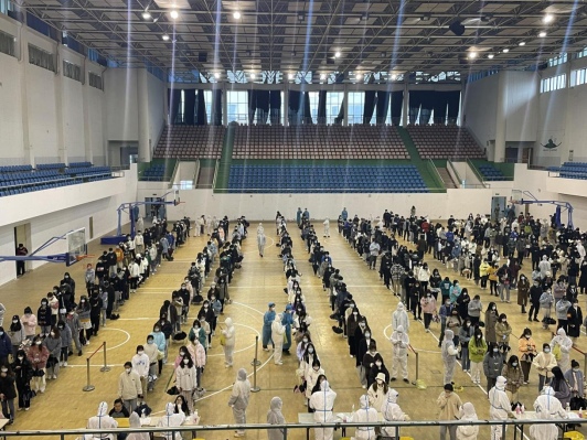 为了与病毒赛跑,保证全校所有人员的核酸检测在区里规定的时间内完成,在完成第二次采集工作后,医疗队建议第三轮检测工作集中安排采集点,这样便于物资运输,样本采集更加高效。于是,第三轮核酸检测工作在瑶湖校区体育馆和济民楼开展,全校共设42个检测点,采集工作仅用了2个小时。