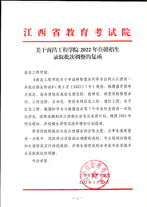 近日,江西省教育考试院发来《关于南昌工程学院2022年在赣招生录取批次调整的复函》,欧博智慧水利、工程造价、自动化、智能电网信息工程、通信工程、电子信息工程、数据科学与大数据技术等7个专业获批列入我省一本批次招生。