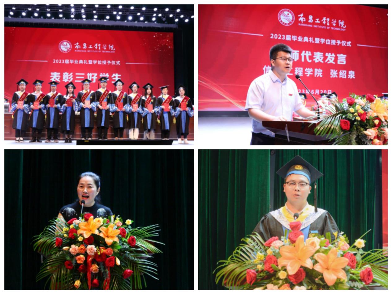 教师代表、信息工程学院教师兼校团委副书记张绍泉博士作发言,希望全体毕业生传承校训精神,终身学习,成就美好未来;树立“民族复兴,强国有我”志向,接续奋进,书写精彩篇章;坚持“守正创新,笃行致远”信念,开拓进取,贡献青春力量。家长代表、水利与生态工程学院2019级水利水电工程专业赖哲坤同学的母亲刘丽娥从孩子的成长经历出发,表达了对学校、对老师的感谢和祝福,希望远行的学子们,踔厉奋发,勇毅前行,时刻保持着进步,在生命中新的港湾继续启航,载着对未来的畅想,披荆斩棘,乘风破浪。毕业生代表、国际教育学院2019级电气工程及其自动化(中韩)郭煜洲同学深情地表达了对母校、老师和同窗们的深情眷恋和感恩之情,将南工四年的求学经历喻为矢志砥砺前行、勇毅追逐梦想、怀揣家国情怀的青春篇,倡议广大毕业生义不容辞地接过时代的接力棒,展示南工学子的责任与担当。