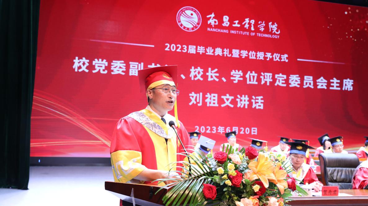典礼在庄严的国歌声中拉开序幕。校党委副书记、校长刘祖文代表学校致词,向顺利完成本科学业的同学们表示热烈祝贺,向辛勤培育他们的父母和老师致以衷心的感谢。他深情地寄语全体毕业生:要牢记习近平总书记给青年的谆谆教诲,以坚定的理想信念照亮新征程上青春之路,以青年之梦想、青春之奋斗、青春之活力,勇做走在时代前列的奋进者、开拓者和奉献者。要以敢于担当的精神点燃新征程上青春之火,始终以“敢”字当头,切实把责任扛在肩头,以“道在迩而求诸远,事在易而求之难”的担当精神,在攻坚克难中锻炼骨气、在自信自强中坚定底气。要以吃苦耐劳的品质走好新征程上青春之旅,学会“自找苦吃”,在学习实践中明辨是非,领悟道理,在各自的岗位上敢于挑起最重的担子、啃下最硬的骨头、涉足最险的滩涂。要以接续奋斗唱响新征程上青春之歌,秉承“自强不息、格物致知”的校训精神,永葆奋进姿态、永远追求卓越,在知行合一中实现思有方、谋有据、做有成,在开拓人生、奉献社会的进程中绽放绚丽之花。