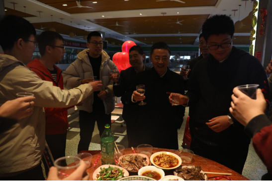 玉鼠除旧岁,金牛报春来。2月11日农历除夕,校长金志农、校党委副书记吴泽俊、副校长陆伟锋一行先后来到学生公寓11栋和沁园餐厅,看望因疫情滞留学校的同学们和留学生,送上团圆礼包和“压岁红包”,和大家一起吃团年饭、过除夕,祝愿全校师生牛年阖家幸福、健康平安。活动现场大家互致问候,祝福连连,欢声笑语不断。相关职能部门同志和部分在学校值班值守的教职员工参加活动。