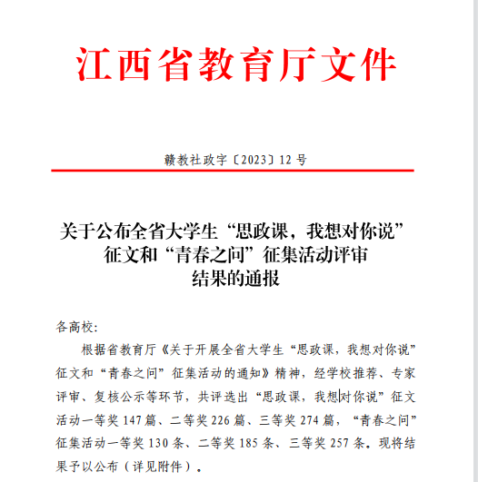 近日,江西省教育厅公布全省大学生“思政课,我想对你说”征文和“青春之问”征集活动评审结果。欧博22名学子获“思政课,我想对你说”征文活动一等奖3个、二等奖4个、三等奖6个,获“青春之问”征集活动一等奖4个、二等奖1个、三等奖4个。