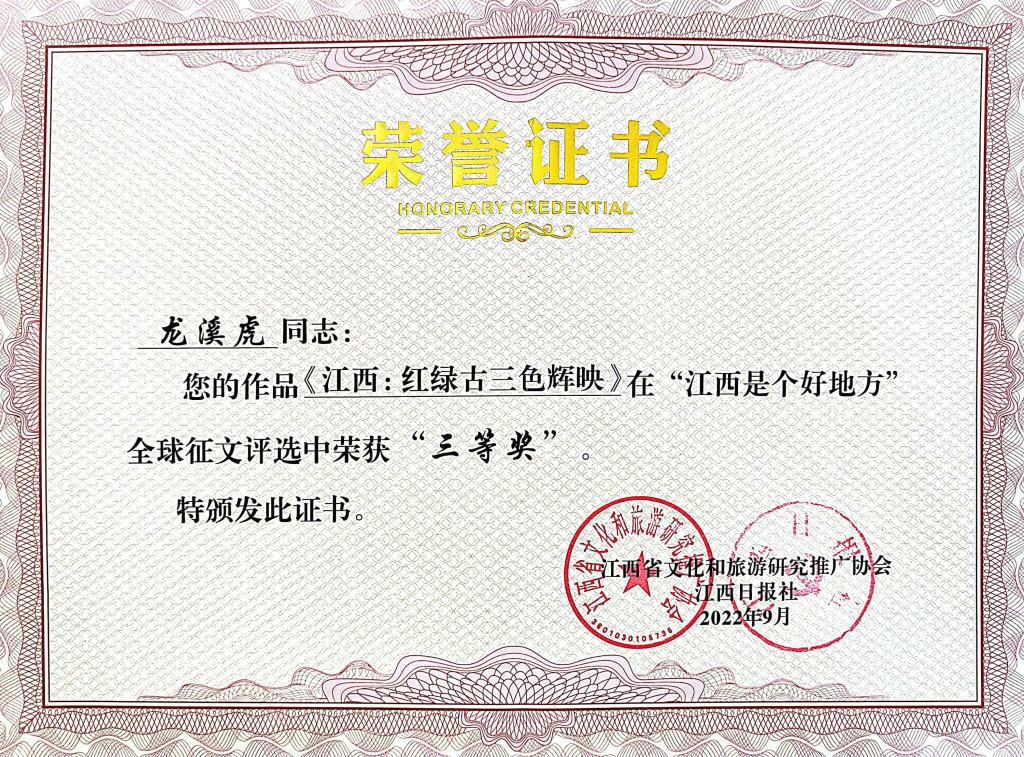 近日,由江西省文化和旅游研究推广协会联合江西日报社共同举办的“江西是个好地方”全球征文评选活动揭晓,欧博龙溪虎教授的征文《江西:红绿古三色辉映》荣获三等奖。