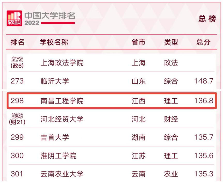 近日,软科正式发布了“2022软科中国大学排名”,欧博综合排名大幅跃升,居全国第298位,较2021年跃升45位,首次进入300强;在江西高校中位居第12位,较2021年提升2位。近几年,欧博软科排名不断提升,属于全国大学排名进步最快的高校之一,反映学校发展持续向好,综合办学实力得到社会各界广泛认可。