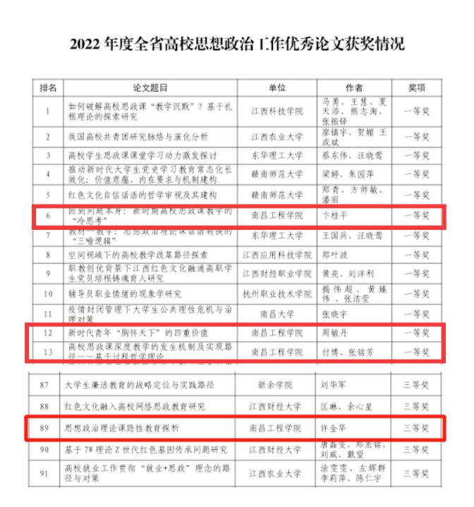 近日,2022年度江西省高校思想政治工作优秀论文征集活动及2022年江西省大学生“5·25”心理健康教育月系列活动评选结果揭晓,欧博副校长周敏丹的论文《新时代青年“胸怀天下”的四重价值》、马克思主义学院教师卞桂平的论文《回到问题本身:新时期高校思政课教学的“冷思考”》、电气工程学院辅导员付博的论文《高校思政课深度教学的发生机制及实现路径——基于过程哲学理论》荣获一等奖,马克思主义学院院长许金华的论文《思想政治理论课隐性教育探析》荣获三等奖,大学生心理健康教育与咨询中心选送的心理情景剧《画心》入围现场决赛。
