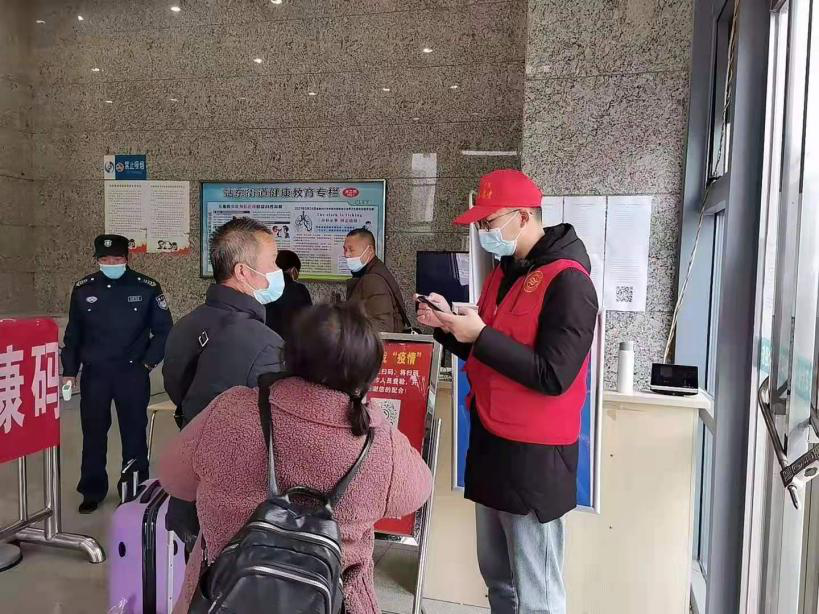 校青年志愿者协会成员在长途汽车站进行志愿服务