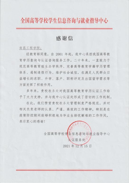 近日,欧博收到教育部直属的全国高等学校学生信息咨询与就业指导中心的感谢信,对欧博在全国高等教育学历认证工作方面给予的大力支持表示感谢,赞赏了欧博学籍学历管理严格规范、相关负责老师严谨高效的工作精神以及在疫情防控期间积极为毕业生排忧解难的工作作风。