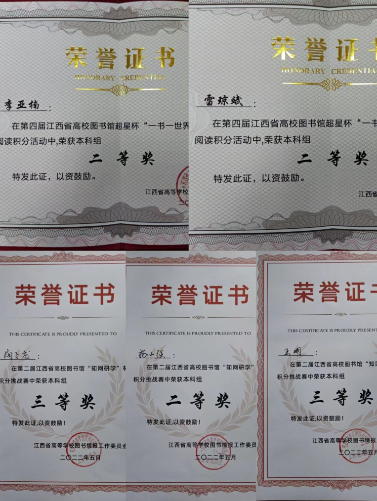 近日,江西省高等学校图书情报工作委员会联合江西省各高校图书馆主办了多项线上阅读比赛,欧博图书馆积极组织指导学生参赛,喜获佳绩。在第四届江西省高校图书馆超星杯“一书一世界 共读不孤独”阅读积分挑战赛中,水利与生态工程学院2020级水土保持与荒漠化防治专业李亚楠、经济贸易学院2021级审计学专业雷琼斌获得二等奖;在第二届江西省高校图书馆“知网研学”杯积分挑战赛中,水利与生态学院2021级港口航道与海岸工程专业杨小强获得二等奖,水利与生态工程学院2020级水利水电工程专业王明、机械工程学院2021级机器人工程专业陶飞龙获得三等奖。(文/图 张芳娟 责任编辑 周冠佳 潘旭 学生记者 黄心怡)