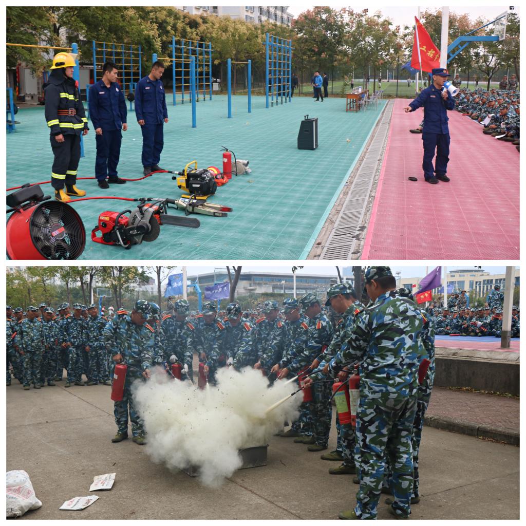 在新生军训期间,学校采取线上阅读军训消防安全读本、完成军训消防作业、集中观看消防视频、消防安全讲座、消防宣传车体验等方式,组织全体新生开展阅读一本消防知识读物、上一堂消防常识课、组织一次疏散逃生演练、举办一次消防实操“四个一”活动。