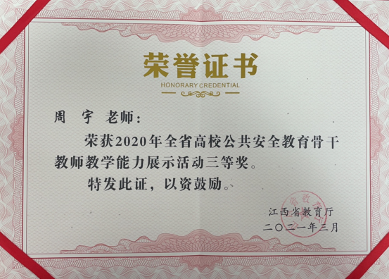 近日,省教育厅举办了2020年全省高校公共安全教育骨干教师教学能力展示活动,欧博周宇老师荣获本科组三等奖。