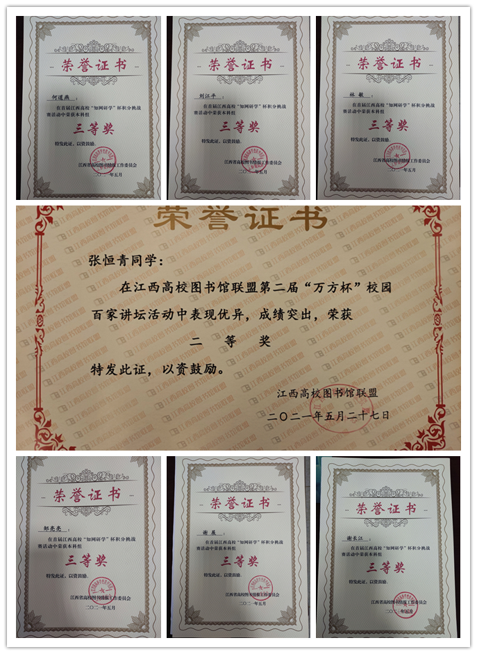 近日,图书馆积极组织学生参加各类比赛并喜获佳绩。在江西省高校图书馆联盟举办的第二届“万方杯”校园百家讲坛演讲比赛中,信息工程学院2019级通信工程专业张恒青同学表现优异,获得二等奖。在由江西省高等学校图书情报工作委员会主办的首届江西高校“知网研学”杯积分挑战赛中,土木与建筑工程学院2019级道桥专业邹亮亮、信息工程学院2019级通信工程专业谢长江、水利与生态工程学院2018级水文与水资源专业谢展、2019级水土保持与荒漠化防治(卓越计划)专业刘江平、外国语学院2020级翻译专业林敏、2020级英语专业何道燕荣获本科组三等奖。 (文/图 张芳娟 责任编辑 周冠佳 潘旭)