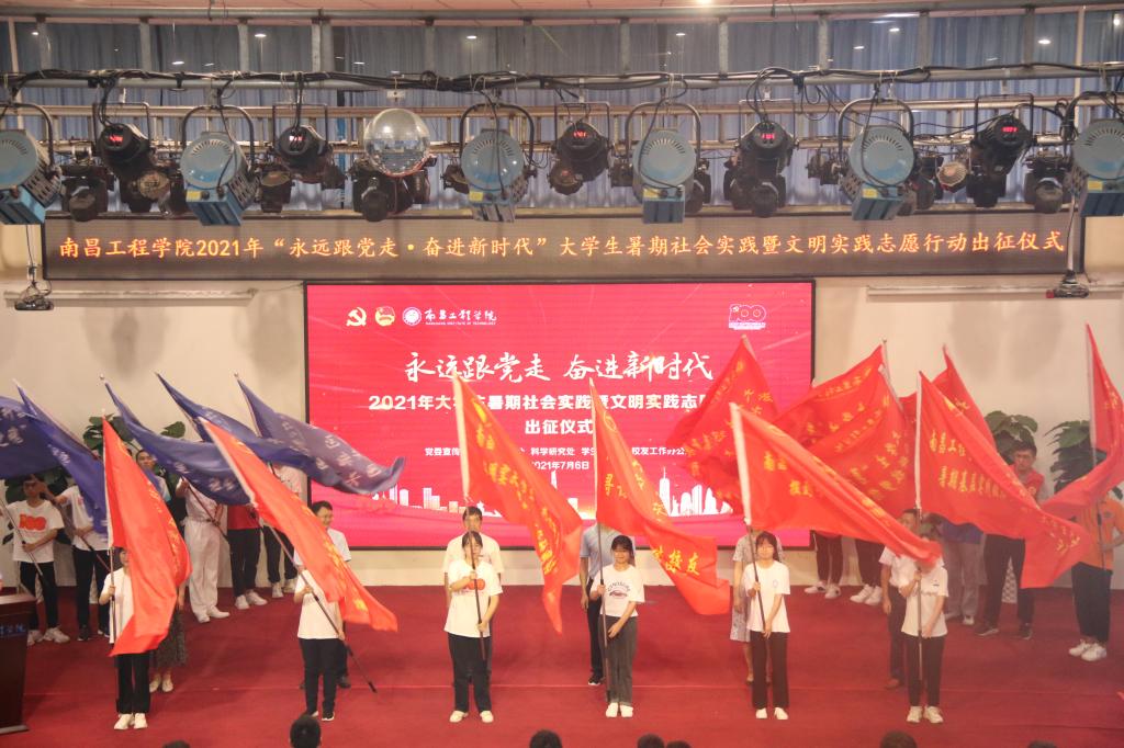 仪式上,与会领导为大学生暑期社会实践团队、文明实践志愿行动团队以及社会实践专项行动网络团支部授旗。实践团队指导老师和团队成员代表分别作表态发言。