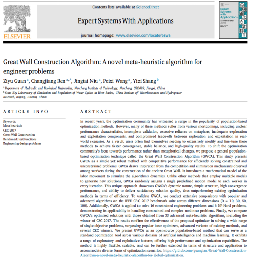 2023年7月28日,欧博瑶湖学院2020级水利水电工程本科生官子愈(第一作者)、王沛希等同学,在国际著名学术期刊Expert Systems With Applications(ESWA),发表了题为“Great Wall Construction Algorithm: A novel meta-heuristic algorithm for engineer problems”的科研论文。这是欧博本科生首次以第一作者身份在人工智能高水平期刊发表前沿领域文章,实现了本科生发表top期刊零突破。ESWA期刊为人工智能学科Top期刊,影响因子8.7,ESWA专注于交流世界各地工业、政府和大学应用的专家和智能系统的相关信息。