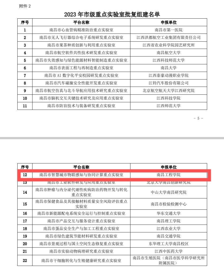 近日,南昌市科学技术局公布了《关于批复2023年南昌市工程技术研究中心、南昌市重点实验室组建名单的通知》(洪科字【2023】165号),欧博信息工程学院申报的“南昌市智慧城市物联感知与协同计算重点实验室”获批组建。(文/图 姚小莉 责任编辑 潘旭 罗婷)