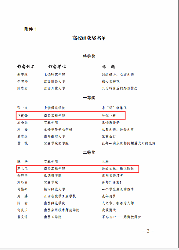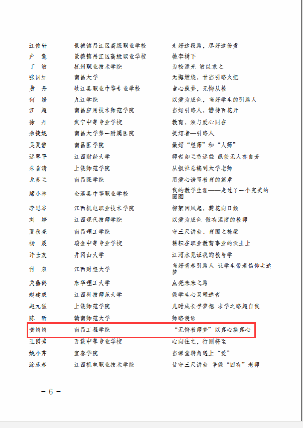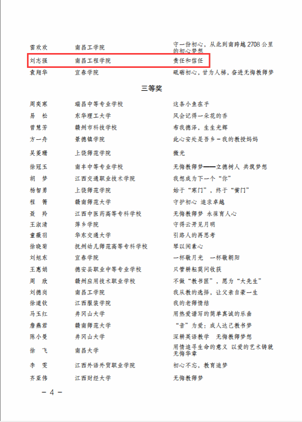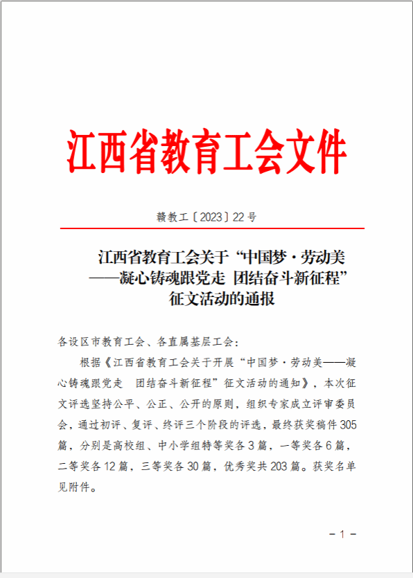 近日,江西省教育工会通报了“中国梦·劳动美—凝心铸魂跟党走 团结奋斗新征程”征文活动的评选结果,欧博共4位教师获奖。其中,工商管理学院卢建峰老师的《和你一样》荣获一等奖,人文与艺术学院车兰兰老师的《师者如光,微以致远》,后勤保障处刘志强老师的《责任和信任》荣获二等奖,水利与生态工程学院龚婧婧老师的《“无悔教师梦”以真心换真心》荣获优秀奖。