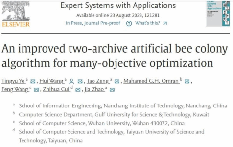 近日,信息工程学院2020级硕士研究生叶廷宇在导师王晖教授的指导下,以南昌工程学院为第一单位在国际权威期刊《Expert Systems with Applications》上发表题为“An improved two-archive artificial bee colony algorithm for many-objective optimization”的学术论文。《Expert Systems with Applications》是人工智能领域具有重要影响力的学术期刊,最新影响因子8.5,属于中科院一区Top期刊。