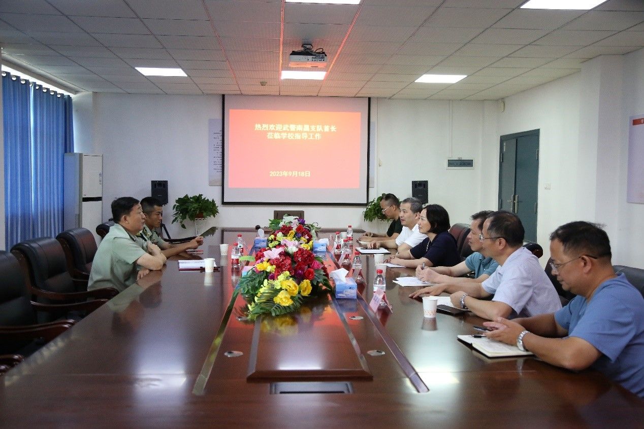 9月18日下午,武警南昌支队政委穆云翔大校,教导队大队长梁斌少校来校指导工作。副校长周敏丹,校党委委员、党委统战部部长欧阳子龙,军士学院党政班子成员参加座谈会。