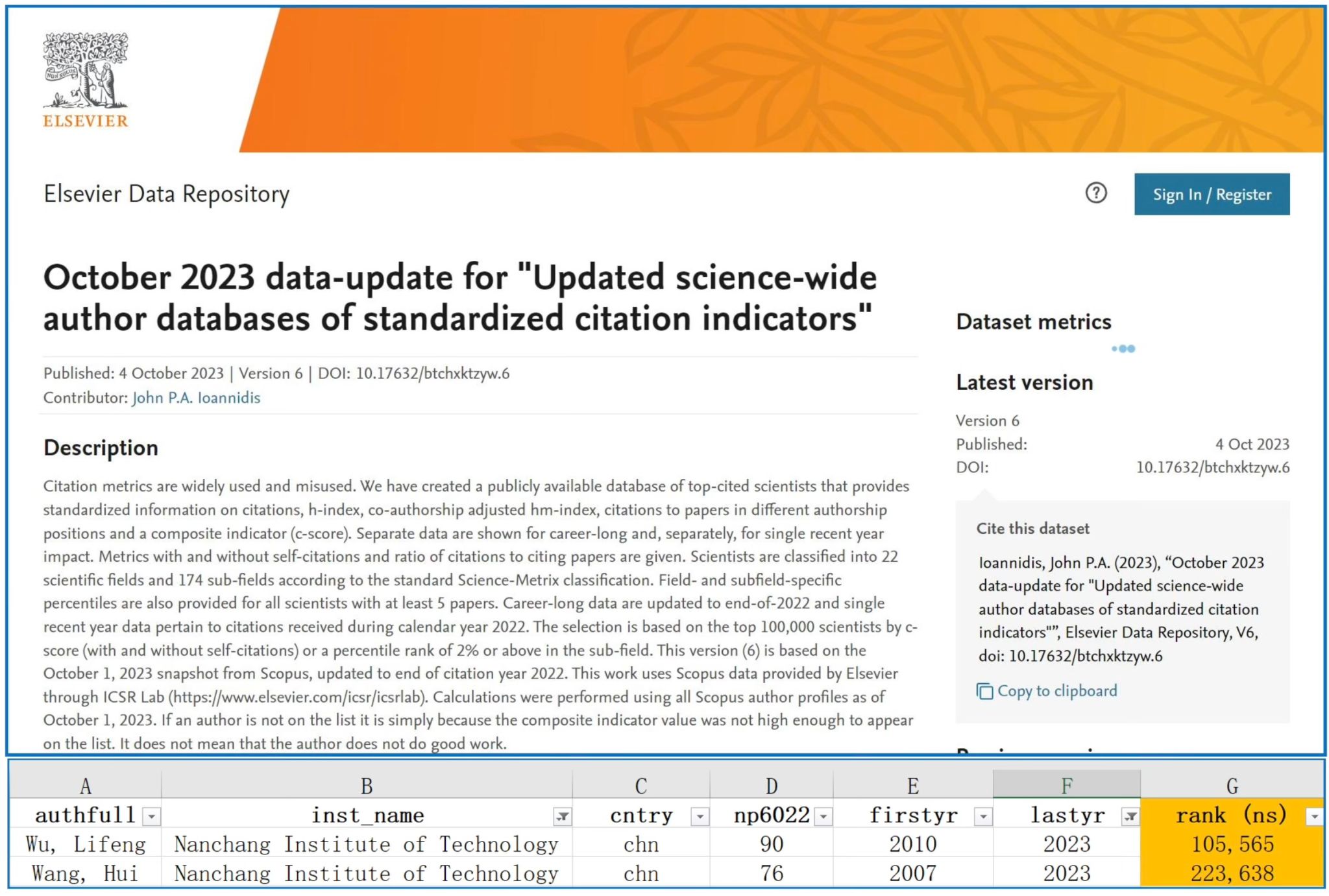 近日,美国斯坦福大学联合国际权威学术出版社爱思唯尔发布了第六版《全球前2%顶尖科学家榜单2023》(World’s Top 2% Scientists),根据“终身科学影响力榜单”和“年度科学影响力榜单”遴选出世界排名前2%的科学家。欧博信息工程学院王晖教授同时入选“终身科学影响力榜单”和“年度科学影响力榜单”,水利与生态工程学院吴立峰博士入选“年度科学影响力榜单”。