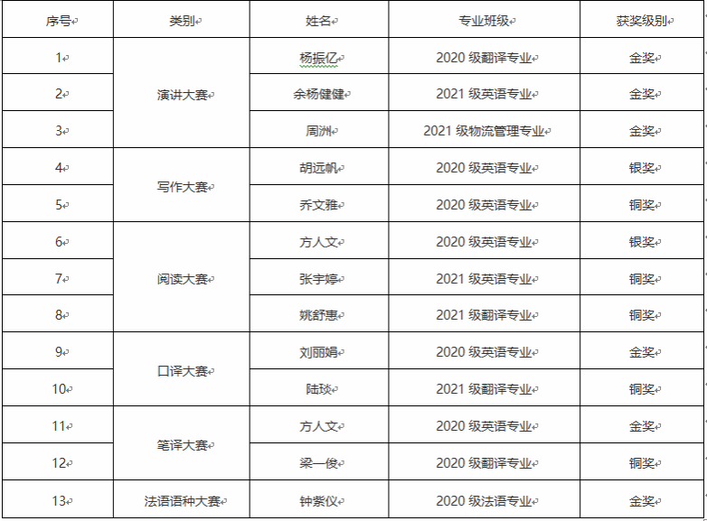 11月4日,外研社·国才杯“理解当代中国”全国大学生外语能力大赛江西赛区复赛落下帷幕,欧博学子喜获佳绩,共荣获金奖6项,银奖2项,铜奖5项,英语、法语、翻译和非外语专业均斩获金奖,获奖面和获奖总数量取得新突破。在演讲比赛中,欧博是所有选手均获金奖的唯一高校。各项获金奖的选手将于12月代表江西参加全国决赛。(文/曾玲娟 图/周薇薇 责任编辑 潘旭 罗婷)