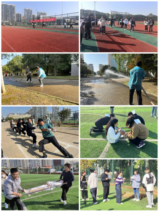 本届大学生消防趣味运动会共设置了“干粉灭火跑步接力”“消防水带灭火接力”“疏散紧急救援”“灭火自救逃生接力”“卷水带甩击‘冰火球’挑战接力”“消防知识技能大闯关”“拔河穿越‘火线’救援”等七个项目,内容紧扣消防主题,融合消防业务技能和趣味性、知识性于一体,以娱乐和竞赛的形式开展。活动过程中,各队参赛选手积极参与,展示团队意识和拼搏精神,深入学习消防安全知识。