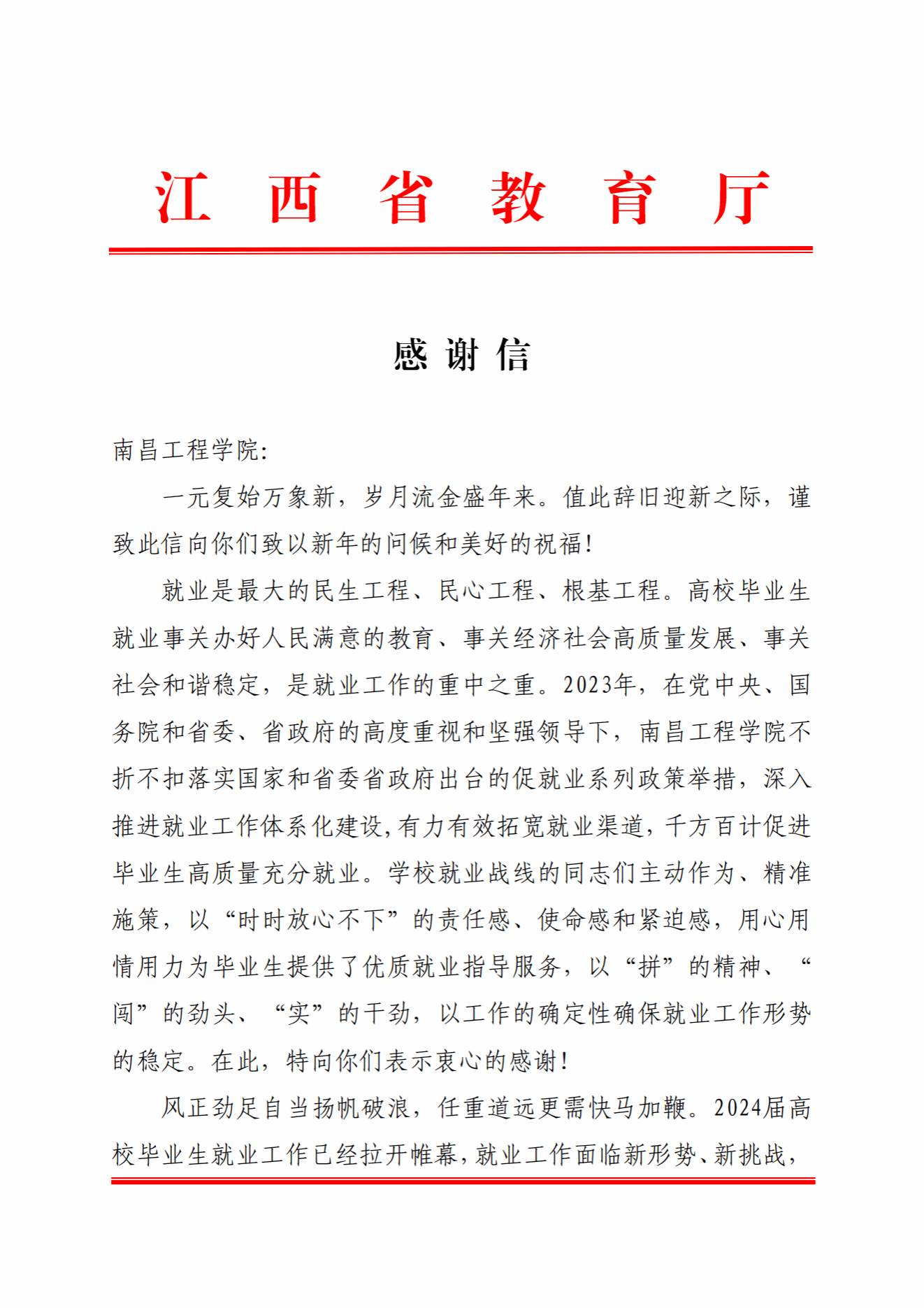 近日,江西省教育厅向欧博致感谢信,对学校党委和行政不折不扣落实国家和省委、省政府出台的促就业系列政策举措,深入推进就业工作体系化建设,有力有效拓宽就业渠道,千方百计促进毕业生高质量充分就业表示感谢!